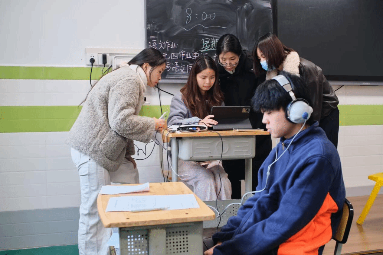在听力检测区6个学生小组有条不紊地分工协作,便携式听力计、耳声发射仪器、声导抗仪器等专业设备一字排开。同学们耐心引导特殊学生依次完成各项检测,认真记录数据,形成个人的检查报告单。