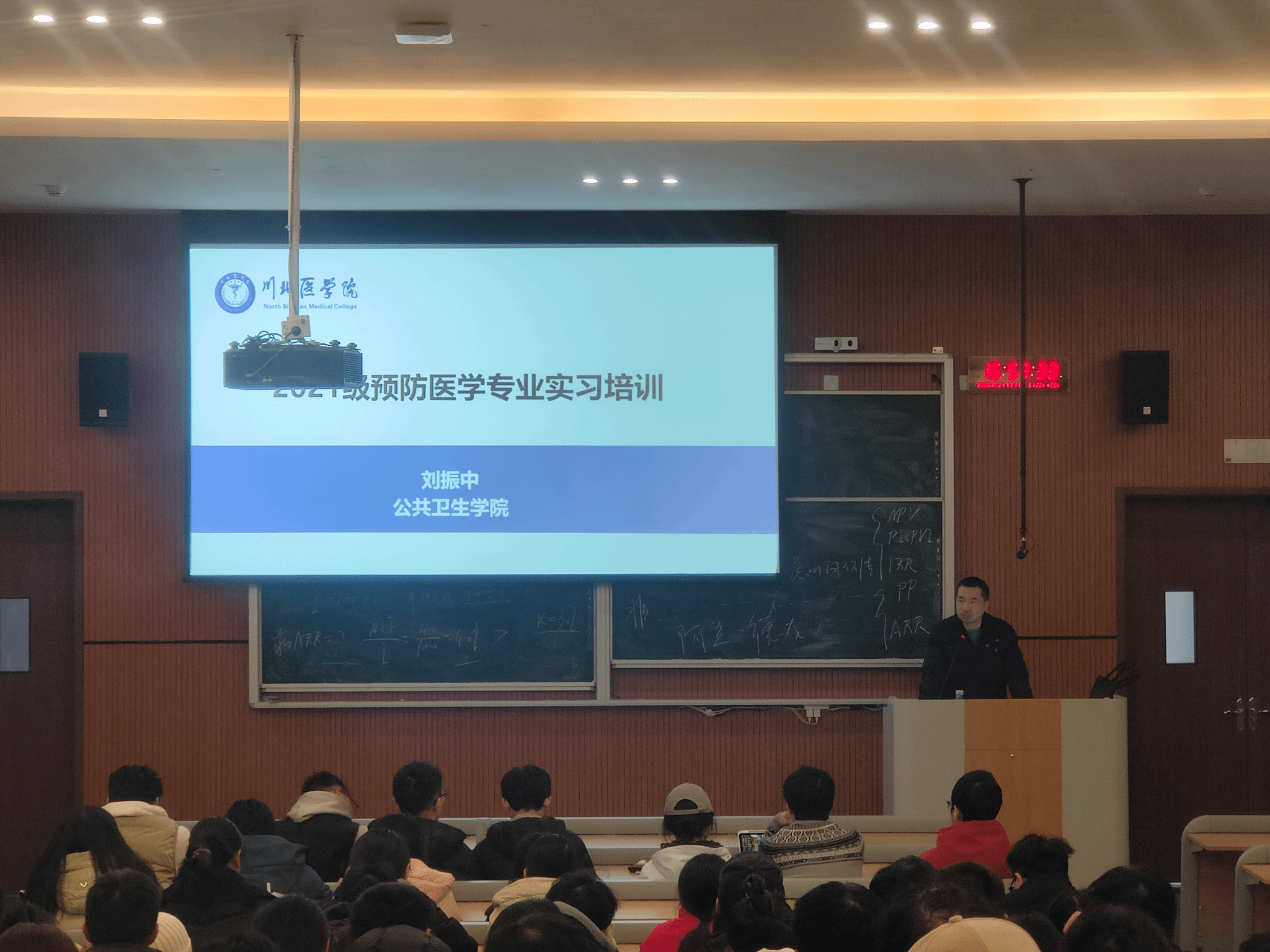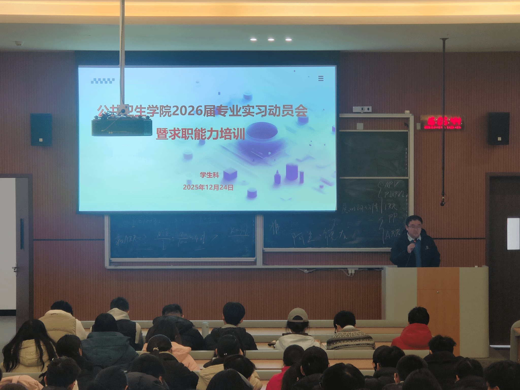 为引导毕业生明确实习要求,认清就业形势,提升求职竞争力,12月24日下午,公共卫生学院在临江书院1号楼108教室召开了2026届专业实习动员会暨求职能力培训会。学院副院长刘振中、学生科辅导员及2021级预防医学专业学生参会。