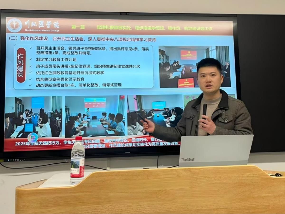 随后,郭斌围绕2025年党建工作开展情况作专项汇报,总结学院在强化党建引领、夯实组织基础、凝聚党建合力等方面成效。针对2026年党建与业务融合发展工作,郭斌书记提出四点要求:一是深化融合,推动党建与专业建设衔接,成立“党建引领专业学科建设领导小组”;二是提质增效,聚焦科研成果产出与转化,围绕核心研究方向,强化团队建设,提升转化质效;三是守正创新,推进教育教学数智化升级,培育教研项目,建设智慧课程,提升教师教学能力;四是强基固本,优化师资结构,对标博士点申报指标,培育骨干教师、引进人才,设立“党员教师示范岗”,健全双轮驱动激励机制,规范党建经费使用,确保用在关键处。