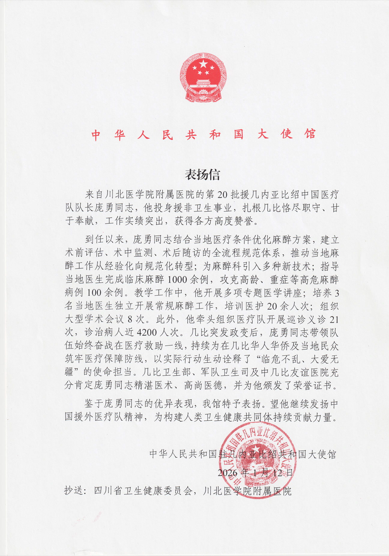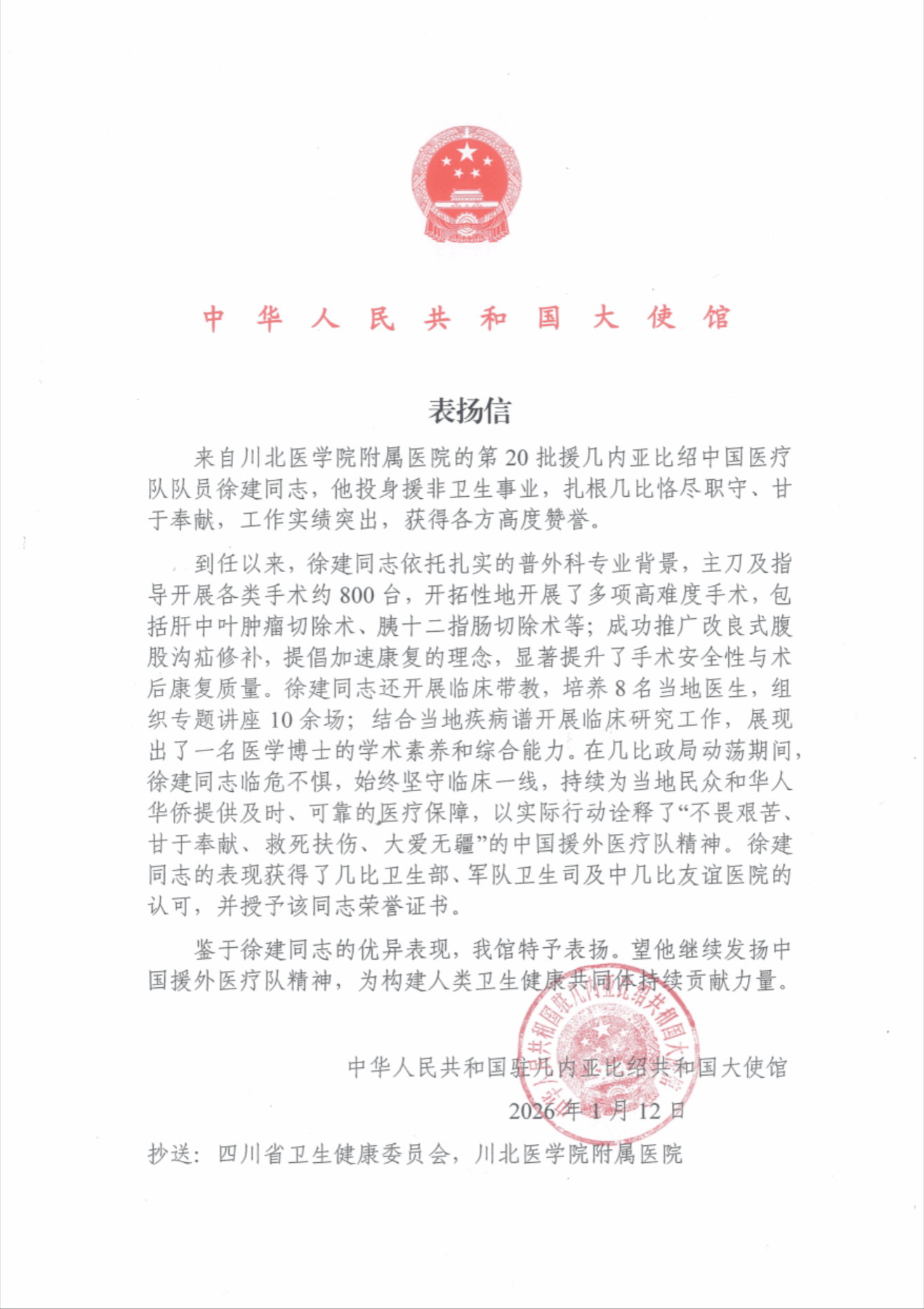 近日,中华人民共和国驻几内亚比绍共和国大使馆向临床医学院·附属医院发来表扬信,对第20批援几内亚比绍中国医疗队队长庞勇、队员徐建两位同志在援非期间的出色表现给予高度肯定和表彰。他们以精湛医术、高尚医德和无私奉献,在异国他乡践行了中国医者的使命与担当。