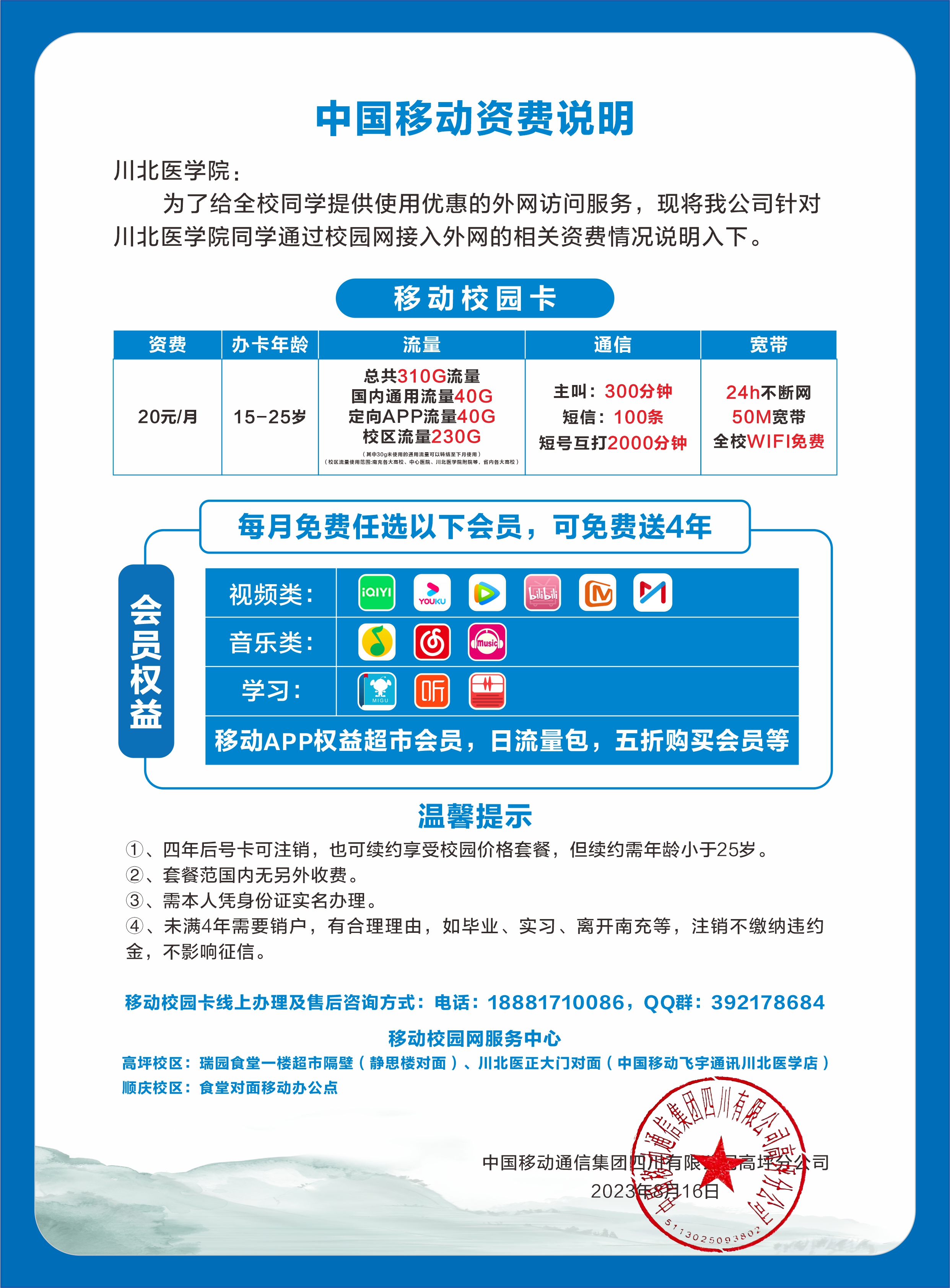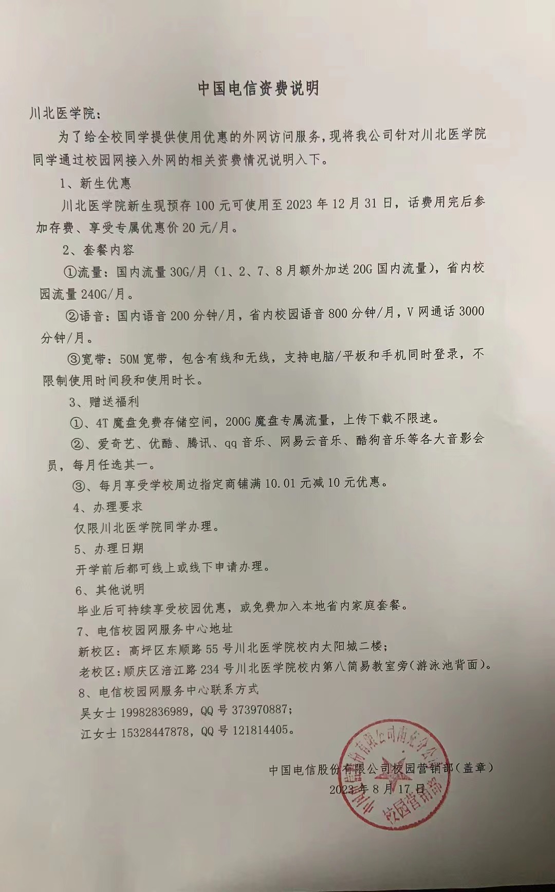 川北医学院校园网是川北医学院教学、工作、生活资源应用网络,免费为在校学生提供校内资源的网络服务。在此基础上,与中国移动公司和中国电信公司合作,向校内学生提供外网资源的访问服务,并由运营商收取相关费用。具体情况如下: