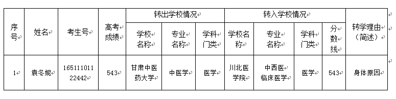 根据《四川省教育厅关于做好普通高等学校学生转学备案工作的通知》(川教函〔2017〕341号)和《川北医学院学生转学管理规定》(川北医发〔2017〕66号),现将学生袁冬妮的情况予以公示。公示时间从2017年9月5日至9月11日止,共5个工作日。公示期内,对公示内容有异议的单位或个人,请以信函、传真或电话等形式向川北医学院反映,并提供相关材料。以单位名义反映的须加盖公章,以个人名义反映的须用真实身份并提供具体联系方式,否则不予受理。我校将根据提供的材料,对反映的问题进行调查核实。