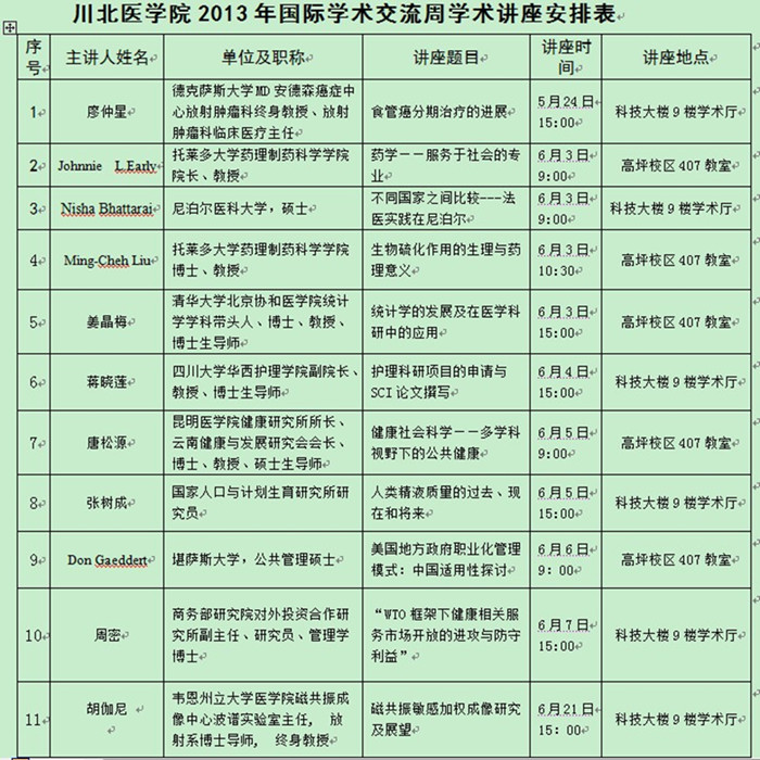 川北医学院2013年国际学术交流周学术讲座安排表