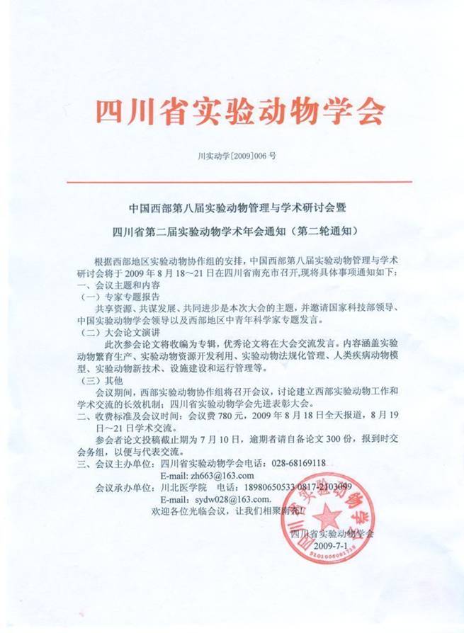 为了加强实验动物管理、加深对实验动物学术的了解,促进合作和交流,推动西部实验动物科学发展,提高动物实验水平,掌握实验动物管理和动物实验实验能力及新进展。我校将于8月18日至20日承办“中国西部第八届实验动物管理与学术研讨会暨四川省第二届实验动物学术年会”,本次会议主题是“共享资源、共谋发展、共同进步”。会议期间将邀请国家科技部领导、中国实验动物学会领导及西部地区中青年科学家专题发言,中国西部各省实验动物学会、中国实验动物学界及相关学科的专家就“西部实验动物科学发展”问题进行探讨和学术交流,从而促进本领域内广泛的联系、合作与发展。请学校相关院系所的专家、教授、科研工作者和实验动物工作者以及研究生积极报名参会。