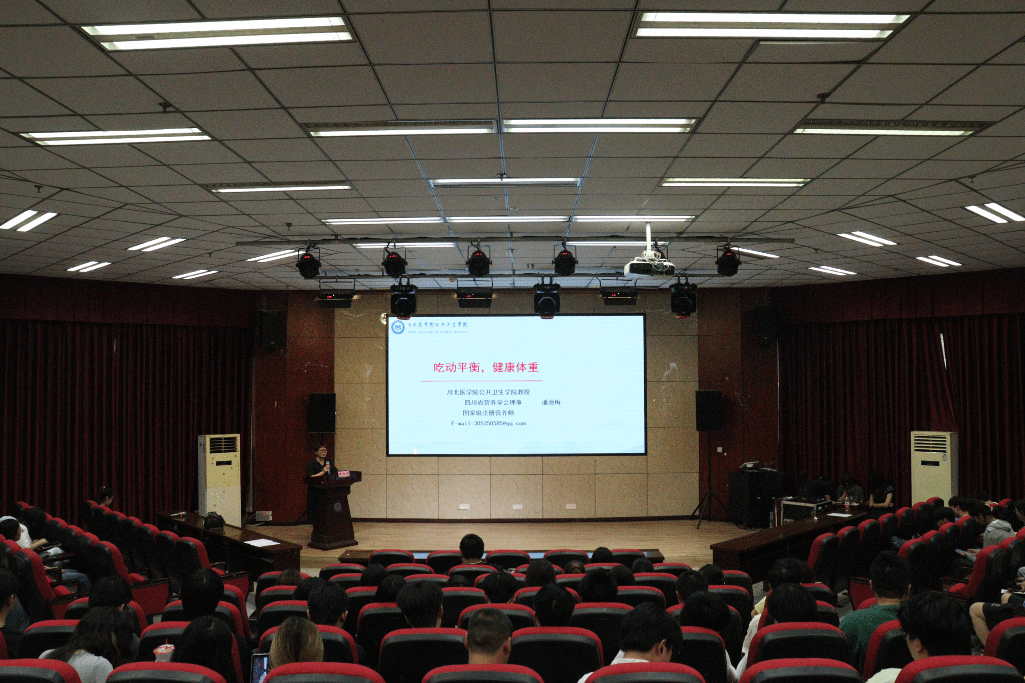 为贯彻落实健康中国行动相关要求,提升师生健康意识,在2025年全民营养周活动之际,5月21日晚,学校松林山大讲堂开展了“吃动平衡,健康体重”专题讲座。讲座由公共卫生学院流行病与卫生统计学教研室潘池梅教授主讲,来自全校各院系的200余名学生参加了讲座。