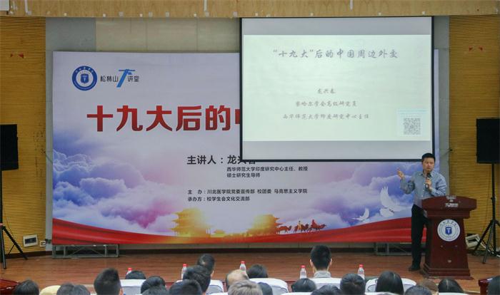 为正确引导我校学子认识中国外交政策,了解十九大后的中国周边外交变化。5月31日晚,西华师范大学印度研究中心主任龙兴春教授受邀在我校高坪校区图书信息大楼407开展了以“十九大后的中国周边外交”为主题的松林山大讲堂活动。党委宣传部副部长霍学超、校团委老师、马克思主义学院老师代表与300余名学子共同聆听了本次讲座。