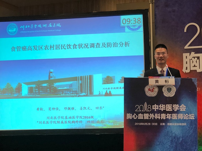 2018年中华医学会胸心血管外科青年医师论坛于6月28-30日在云南省昆明市召开。国内外胸心血管外科著名专家学者出席会议并就专业学科及青年医师培养等话题进行学术报告。我校基础医学院2016级学生黄珩、莫帅佳、邓靓雅、姜凯元组成的科研团队撰写的学术论文“食管癌高发区农村居民饮食情况调查及防治分析”入选大会发言,黄珩同学受邀参加大会并作交流发言,成为中华医学会胸心血管外科青年医师论坛最年轻的交流学者。其精彩的汇报,受到多名参会专家及主持人的高度评价。莫帅佳和姜凯元同时被选为大会壁报展出。