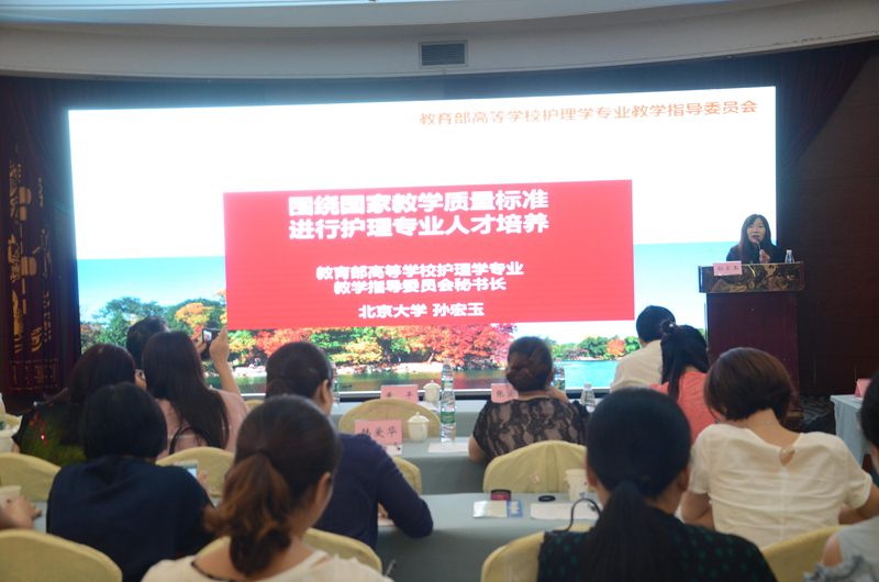 随后,教育部高等学校护理学专业教育指导委员会秘书长、北京大学护理学院孙宏玉教授,以“围绕国家教学质量标准进行护理专业人才培养”为题,阐述了国家质量标准的研制过程、解读、贯彻和思考等问题。护理学类国家教学质量标准的研制,以护理学本科教育为主要适用对象,针对我国本科护理教育的基本情况提出要求,各高校可根据自身的定位和办学特色进行细化,但不得低于本基本标准相关要求。在护理学专业认证方面,重点考察护理学专业教育目标、办学标准和质量保障体系的实现情况,并确认承保材料的有效性。作为资深认证专家,孙教授在风趣地阐述了在护理学专业认证试点工作中发现的特色、主要问题及专家在认证过程中是如何保证认证过程的独立性、客观性和公正性等。孙教授的讲解使我们更加清晰的认识了国家教学质量标准,对护理学专业认证工作的开展极具指导意义,为我院积极开展国家标准的贯彻和落实工作指明了方向。