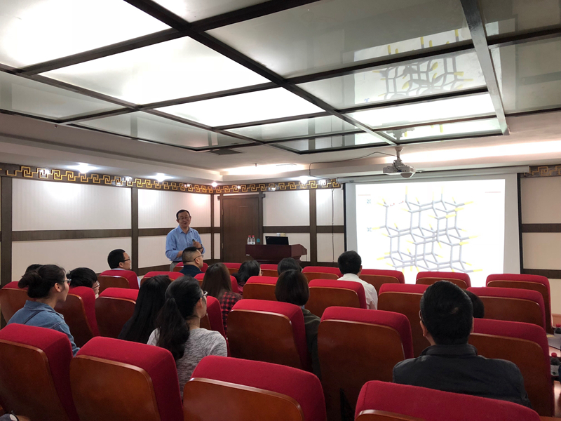 次日上午,黎教授在科技大楼四楼学术厅面向全校师生作了题为“纳米超分子框架材料(SOF)药物输送体系和超分子药物”的学术报告。学校副院长张小明及相关专业科研人员参加学术报告会。报告会由科技处处长邓世山主持。报告从介绍无机、有机及高分子多孔材料的特点及存在的问题出发,提出在水相中通过自组装策略利用非共价键为驱动力构建纳米尺度均相有序孔结构-超分子有机框架(SOF)材料新概念,通过列举大量实例说明目前国内外脂质体药物和普通药物的发展现状,并提出了一些在载体药物发展方面的独到见解。