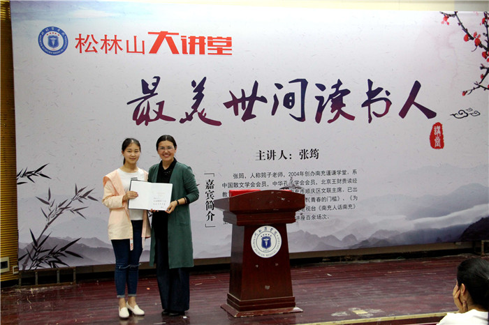 5月3日晚,在学校高坪校区图书信息大楼407教室,松林山大讲堂特邀南充市顺庆区文联主席、南充谨谦学堂创办人、中国散文学会会员、中华孔子学会会员张筠老师开展“最美世间读书人”专题讲座。党委宣传部、校团委等部门同志与400余位师生共同聆听了讲座。