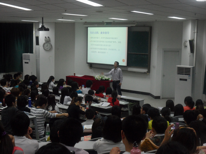 讲座围绕医学生时事热议话题展开,讲解了医学生在学习、实习和规陪之间的转换关系,分析了医学生的职业规划与就业指导,阐述了医学生继续深造(包括规陪进修、考研读博、留洋出国等)的方向途径。互动环节中,杨小霖与在座同学就大家学习生活中遇到的问题与进行了交流。