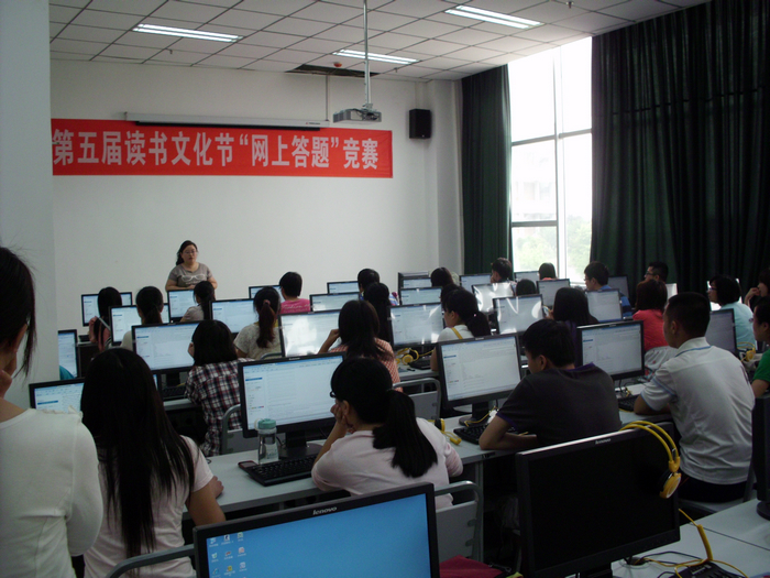 为引导学生充分利用图书馆购置的银符考试题库等教学资源,进行计算机等级考试、英语等级考试、公务员考试、执业医师考试等考试项目的模拟训练,5月6日上午,第五届读书文化节系列活动之“网上答题竞赛”在图书馆新馆检索技能培训室开赛。