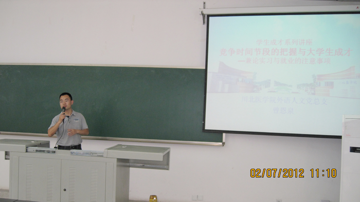 7月2日上午,外语人文党总支学生成才讲座在高坪校区图书信息大楼101教室举行。该党总支副书记曾恩泉围绕“竞争时间节段的把握与大学生成才-兼谈实习与就业的注意事项”这一主题与在场同学进行了交流。讲座中,曾恩泉以“生命与时间是二位一体的关系”这一问题切入,着重针对外语系和公共事业管理专业即将跨入大四的同学们讲解了当前面临的任务和所处的人生阶段,分析了毕业实习与当前的就业形势,希望同学们把握好人生的关键时段,正确认识社会竞争,掌控自我,积极面对、主动参与竞争,从现在开始加倍努力,力争为大学生活画上圆满的句号,为人生的新阶段打好发展基础。