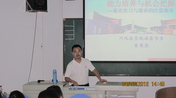 7月4日下午,法医学系邀请法医学专业教师、外语人文党总支副书记曾恩泉为该系2008级同学进行临床实习阶段总结与就业指导培训。培训会上,曾恩泉以“能力培养与机会把握”为题,从当今社会对大学生能力的要求标准切入,详细分析了同学们在大学学习生活不同阶段的特点和任务。曾恩泉表示,大家正处在人生的重要阶段,要认清形势、珍惜时间、统筹安排,为将来发展打好基础。曾恩泉还就法医专业实习、法医专业学生的就业去向、面试等问题与同学们进行了交流。