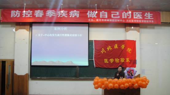 2011年3月21日,以“防控春季疾病,做自己的医生”为主题的知识讲座在北一教室成功举办。此次讲座是由南充市疾病预防控制中心和川北医学院医学检验学系联合主办,旨在提高学生对春季易感疾病危害性的认识并做好相应的防控措施。讲座上,南充市疾控中心传染病免疫规划所赵林向同学们讲授了甲型H1N1流感、红眼病等春季易感疾病的病症和防控措施,着重讲解了大家最为关注的甲型H1N1流感,帮助同学们正确认识这一流行疾病的传播途径,防控措施及流感疫苗的相关知识。