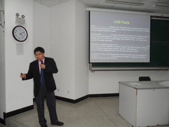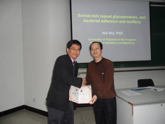 为迎接我校60周年校庆,营造更好的学术氛围,学校科技处、基础医学院特邀美国阿拉巴马大学吴辉教授来我校进行学术交流。4月11日下午4时,吴辉教授在顺庆校区第一教学楼202教室作了题为《链球菌富丝氨酸糖蛋白类与生物膜》的学术讲座。讲座由基础医学院副院长陈建业教授主持,科技处处长杨小红教授及我校部分师生参加了此次讲座。