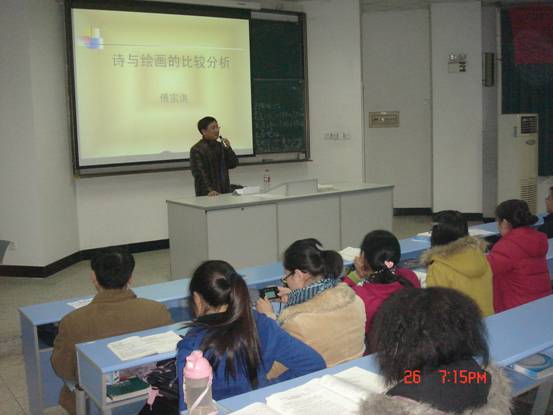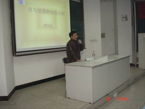 傅宗洪教授主要从事中国现代诗歌、音乐文学及流行音乐的评论和研究,系中国现代文学研究会会员、中国当代文学研究会会员、中国音乐文学学会理事。傅教授结合自己在诗歌与绘画方面多年的研究成果,通过大量生动、翔实的图片及文献资料,从崭新的角度给大家介绍了诗与画的区别与联系。傅教授精彩的演讲,为大家奉献了一场精彩的文化大餐。