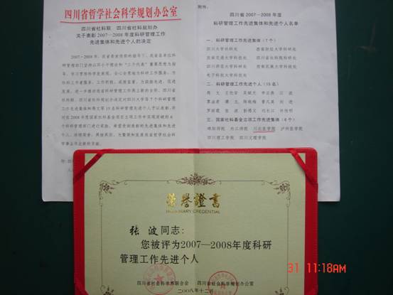 本次获奖是四川省社科联对我院2008年社科工作的充分肯定,这与学院领导长期以来对社科工作的关怀和支持及科技处、广大科研人员的共同努力密不可分,为我院以后的社科工作取得更多、更大的成绩奠定了良好的基础。