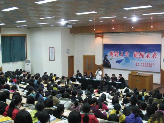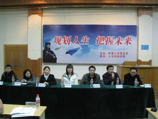 首先,外语人文党总支2005级考研成绩优异的学生代表刘玲玲、蒋明思、李雪平、周敏分别介绍了自己的考研经历,结合专业特点讲述了他们在准备考研时不同阶段的经验和方法,并提出了“信心、恒心、静心”的考研准则,同时鼓励学弟学妹坚持不懈,不遗余力寻找机遇,不拘一格增长能力。