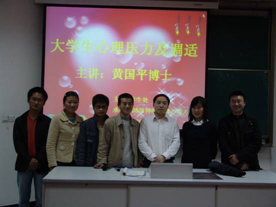 3月22日晚7点,四川省精神卫生中心的黄国平博士于在我院西校区新101教室举办了题为《大学生心理压力与调适》的讲座,黄国平博士系我校92级校友,中南大学国家重点学科精神卫生学优秀博士毕业生,现主要从事精神应激与心理治疗工作。