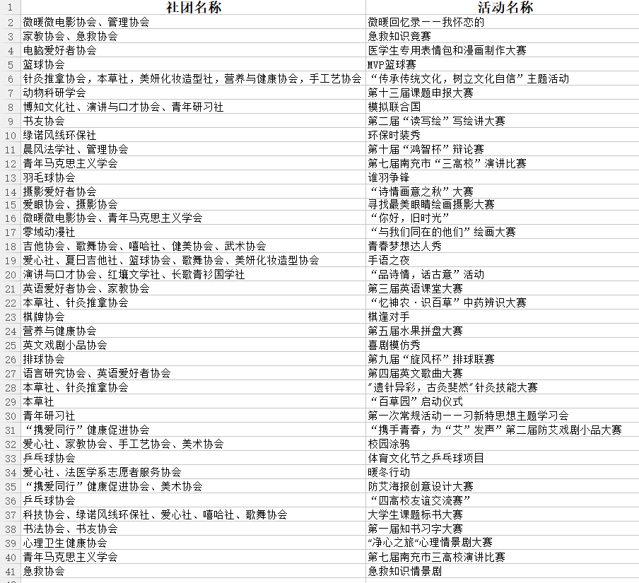 根据川北医学院学生社团活动的申请流程,经分管主席审核,主席团会议讨论,选出以下40个活动,即为11月拟开展活动,现进行公示: