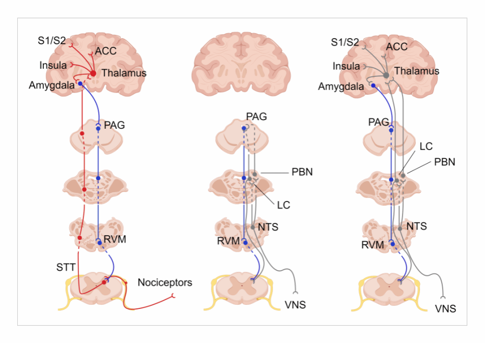 此外,VNS通过抗炎减轻外周炎症,抑制脊髓疼痛信号传递,同时激活脑干下行抑痛系统,调节5-羟色胺和去甲肾上腺素释放,增强镇痛效应;VNS还影响大脑情绪处理区域,改善疼痛相关情绪反应,促进自主神经平衡,有效缓解焦虑和压力,展现出治疗免疫性疾病相关疼痛与情绪障碍的巨大潜力。