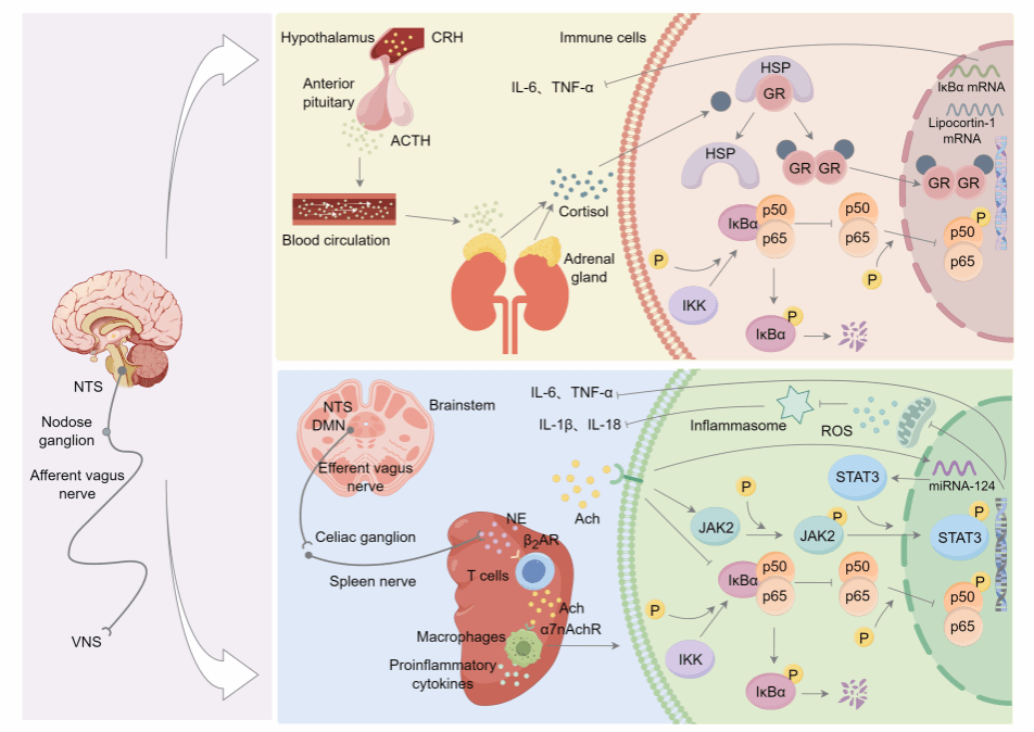 VNS抗炎作用主要依托两大通路:一是胆碱能抗炎通路(CAP),通过激活迷走神经,信号传至脑干并促使脾脏释放去甲肾上腺素,刺激乙酰胆碱(Ach)产生,Ach作用于巨噬细胞α7受体,激活JAK2/STAT3信号通路,抑制NF-κB,降低炎症因子释放;二是下丘脑-垂体-肾上腺(HPA)轴,炎症信号促使下丘脑释放促肾上腺皮质激素,刺激皮质醇分泌,皮质醇抑制NF-κB并增强抗炎基因表达,实现精准的免疫调节与炎症控制。