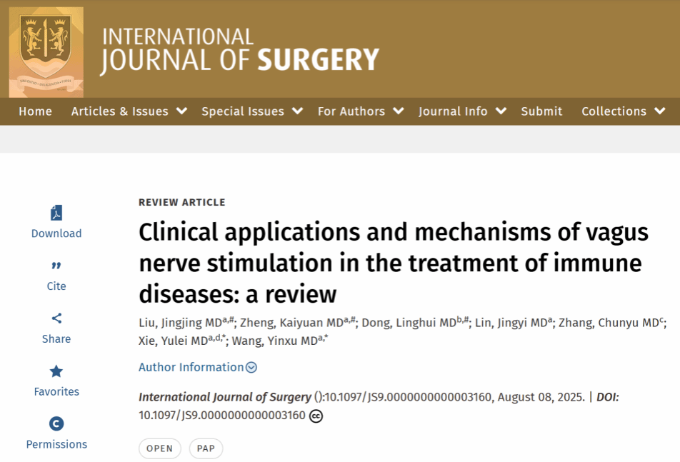 论文引用:Liu, J., Zheng, K., Dong, L., Lin, J., Zhang, C., Xie, Y., & Wang, Y. (2025). Clinical applications and mechanisms of vagus nerve stimulation in the treatment of immune diseases: a review. International journal of surgery (London, England), 10.1097/JS9.0000000000003160.