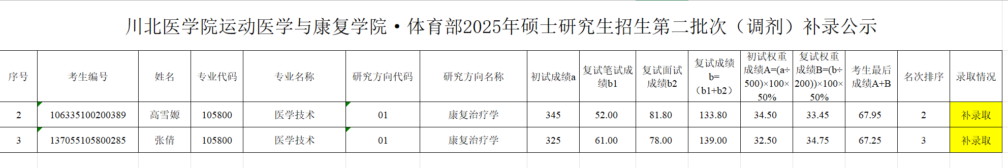我院医学技术(康复治疗学)新增2个硕士研究生招生指标,拟在医学技术(康复治疗学)候补录取考生中,根据总成绩从高到低补录。现公示我院2025年硕士研究生补录名单。