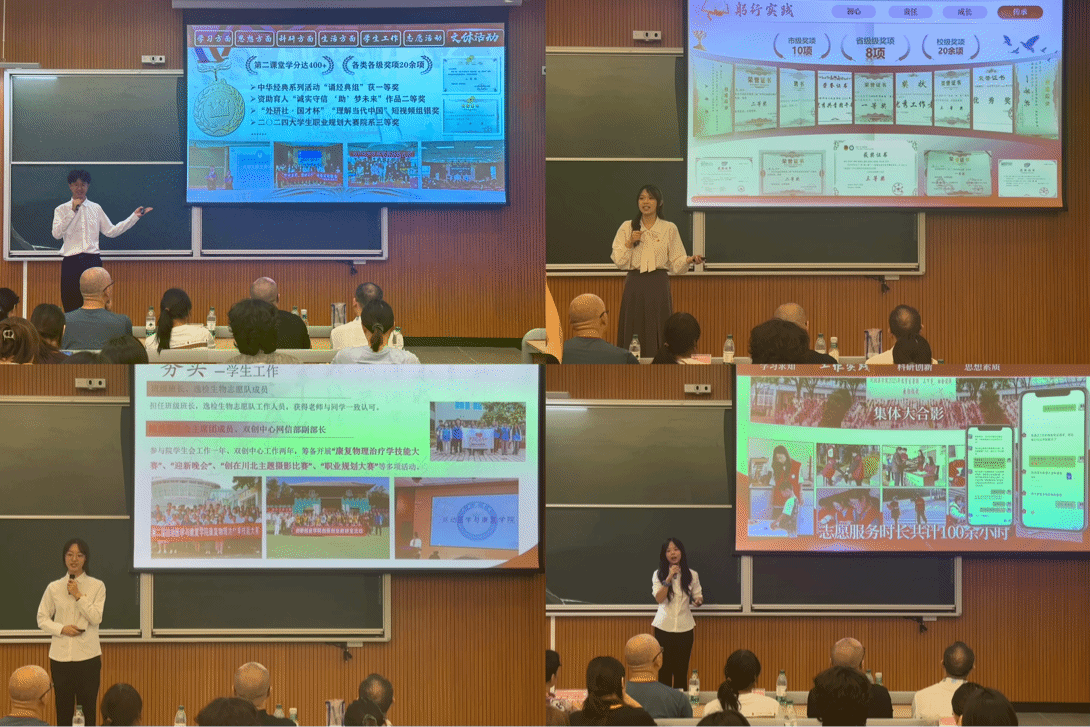 24级听力与言语康复专业的隆欣怡婷,以专业课程的优异表现率先亮相,为答辩拉开精彩序幕;24级康复物理治疗专业的王欣桐,在文体领域绽放独特光彩,让大家看到专业之外的多元精彩;22级听力与言语康复专业的肖丁齐,学业与学术齐头并进,“专注”二字是他最鲜明的标签,成绩获取与学术打磨,皆展现出极致投入;22级运动康复专业的梁传会,满怀着对学术拓展的热爱分享,为同学们打开学术探索的新窗口;24级听力与言语康复专业的李雨唐、23级听力与言语康复专业的周亿、23级康复物理治疗专业的胡豫婷以及24级运动康复专业的李佳坤,也各自从专业深耕、科技创新、赛事比拼等不同维度,展现出“康复人”的担当与风采。