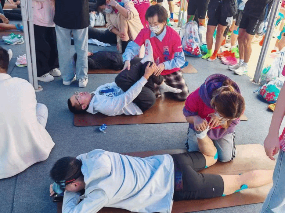 赛事当天,志愿者们提前抵达现场,迅速完成拉伸服务区的布置工作。随着首批选手冲过终点,服务区即刻投入运转。面对大量完赛跑者亟待放松的需求,志愿者团队创新性地构建了 “主动拉伸”与“被动拉伸”相结合的二维服务体系,精准满足不同跑者的个性化恢复需求。在被动拉伸区,志愿者们运用推拿、筋膜按压等专业手法,为疲惫的运动员进行一对一深度放松,有效缓解肌肉僵硬与酸痛。而在主动拉伸区,志愿者们则化身“指导教练”,耐心讲解动作要领,引导跑者利用瑜伽垫、泡沫轴等工具进行自主拉伸训练,帮助他们掌握科学的自我恢复。
