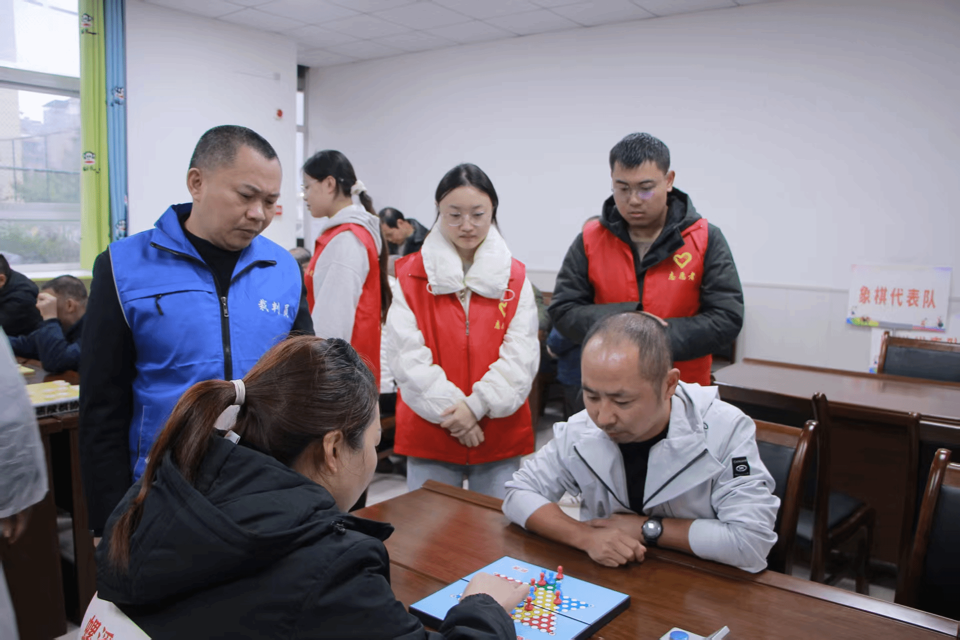 赛事当天,志愿者们参与多个阶段的赛事工作,赛前热身,针对残疾人运动员的特殊需求,志愿队为田径小组演示热身动作,降低运动损伤风险。赛事保障上,随着各项目陆续展开,志愿者分区域提供精准服务。田径赛场上,志愿者定点值守,实时关注运动员状态,协助处理突发情况。在棋类赛区有专人巡回观察,赛后及时回收象棋、跳棋等器材,引导运动员有序离场。午间时段,志愿队参与午餐分发,根据康复中心提供的饮食,将餐食快速、准确分发至每位运动员手中,确保及时补充能量。餐后主动清理垃圾、回收餐具,减轻康复中心保洁压力,展现“事无巨细”的责任意识。