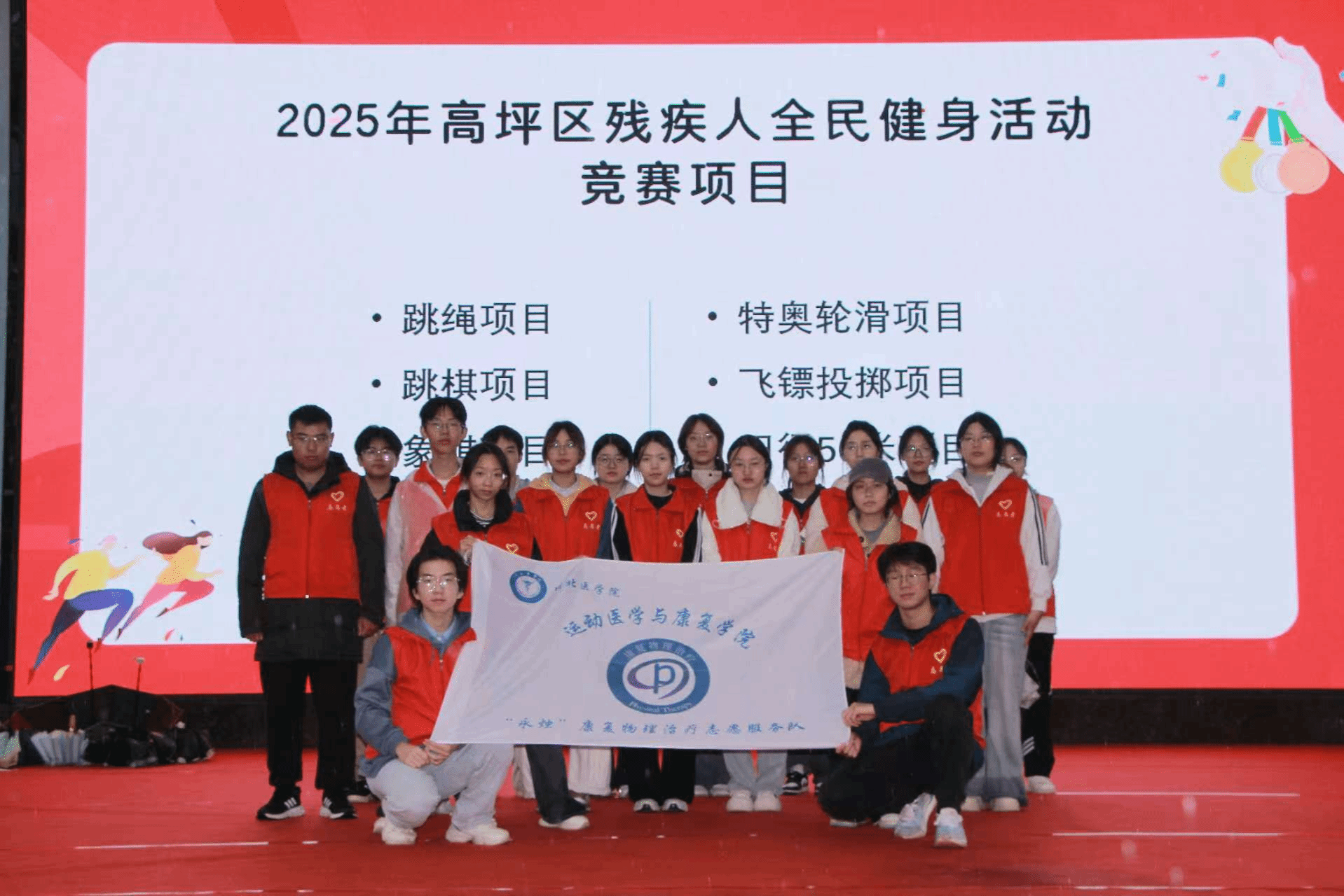 11月14日,在南充市高坪区特殊教育学校,“永烛”康复物理治疗志愿队协助南充市高坪区残疾人联合会成功举办2025年残疾人全民健身活动。志愿者们身着统一红色制服,全程参与多个项目的志愿服务,以赛前科学热身、赛事高效保障、后勤精细支持,为全区18个乡镇(街道)和特校共19支代表队的一百二十余名残疾人运动员提供专业贴心的帮助,践行“平等参与、健康共享”的理念。
