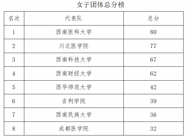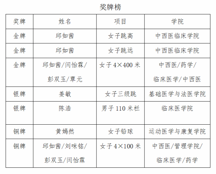 我校20名队员参加了女子短跑、中长跑、跳高、跳远、三级跳,男子短跑、中长跑、铅球,男女接力等20余个项目,运动健儿经过激烈地角逐,获得3金2银2铜,校园组团体总分第三名(93分),校园组女子团体总分第二名(77分) 的好成绩,创造历史!中西医临床学院2024级邱如茜表现尤为突出获得女子跳高金牌、女子跳远金牌、女子4×400米金牌和女子4×100米铜牌。同时我校评选获得道德风尚奖。