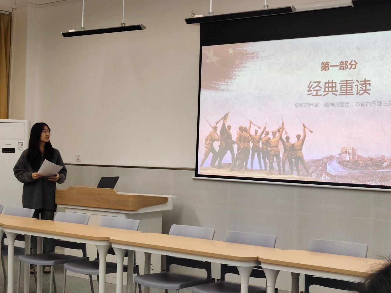 分享会上,胡豫婷首先围绕 “经典重读” 展开讲解,详细介绍了《清贫》作者方志敏的革命生平。作为红 10 军团军政委员会主席、中共闽浙赣省委书记,方志敏 1934 年被捕后,在狱中依旧用笔墨践行 “生存一天就要为中国呼喊一天” 的誓言。随后,她深入解读了 “清贫” 的三重境界:以 “经手数百万元公款却分文不取” 诠释极致自律,以 “面对威逼利诱仍微笑从容” 彰显精神富足,以 “将朴素生活作为战胜困难的武器” 传递革命乐观主义,让学子们深刻理解 “清贫” 的本质是对信仰的绝对忠诚。