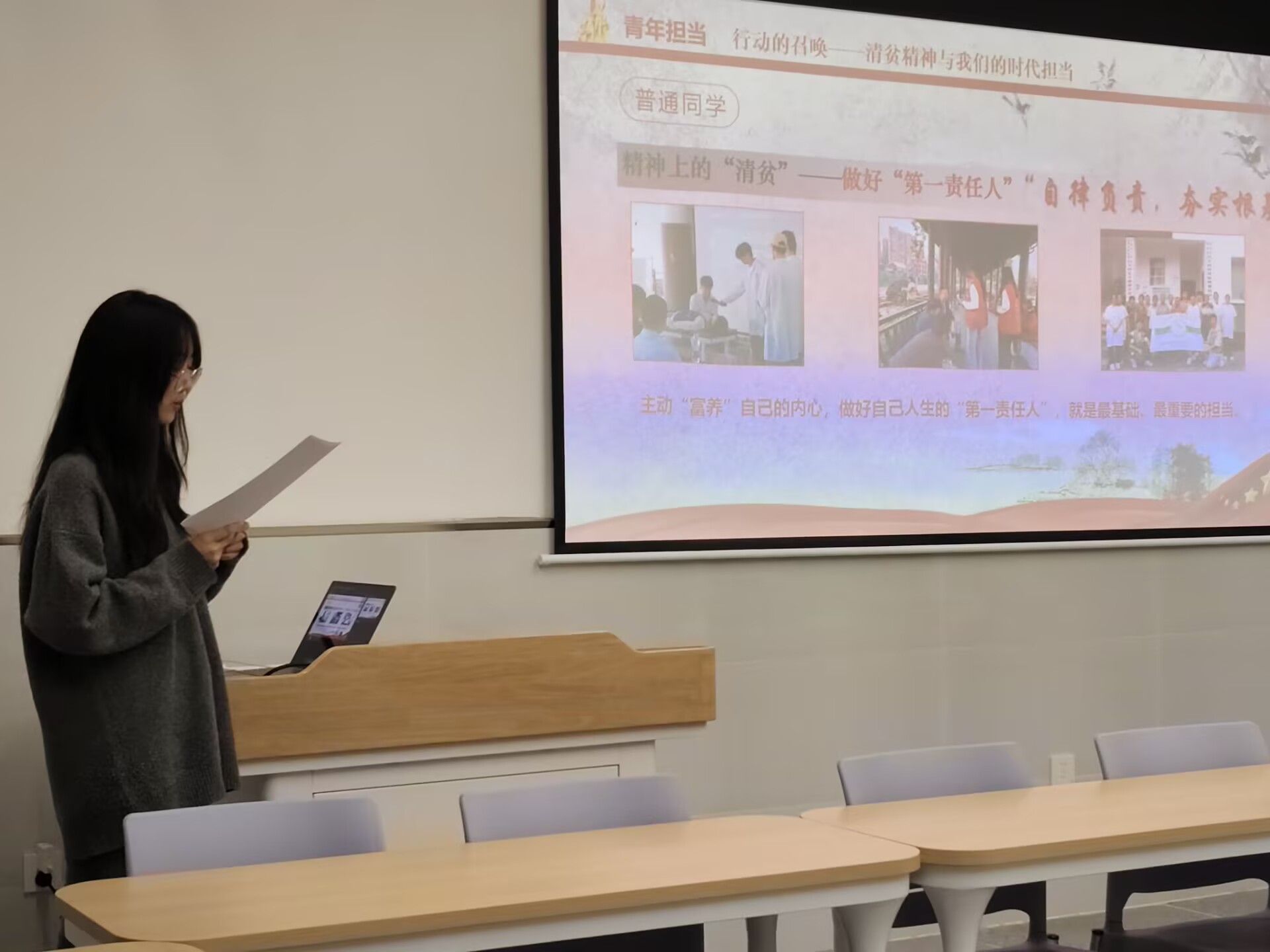 此外,胡豫婷还结合学生身份提出行动号召:普通同学要 “富养内心”,做人生的 “第一责任人”;学生骨干要反对 “学生官” 风气,让 “微权力” 为公所用;入党积极分子与发展对象要保持入党纯粹性,以更严自律践行奉献精神,将对革命先辈的崇敬之情,转化为对专业的精益求精和对他人的无私关怀。
