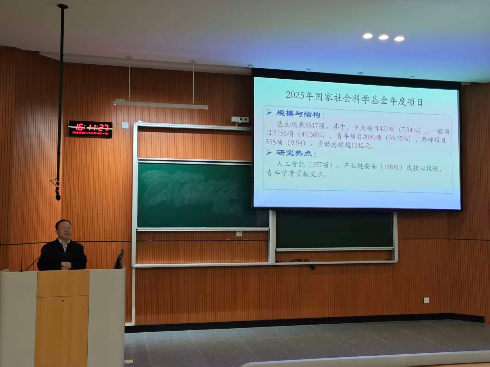 为精准对接2026年度国家社科基金申报要求,破解跨学科研究申报痛点,10月20日下午4点,“语言智能如何赋能国家社科申报”专题讲座在甘露书院北104成功举办。本次活动由科技处主办,外国语言文化系、川北健康人文研究中心联合承办,特邀四川外国语大学嘉陵特聘教授、博士生导师姜孟教授主讲,外国语言文化系副主任杜军教授主持,系部全体教师及校内相关领域科研骨干悉数参会,为2026年高级别课题申报开展针对性赋能。
