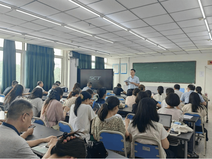 随后,外语系主任张思国从教育教学提质、学科建设突破、学生培养成果和管理效能优化四个方面系统总结了上半年的工作亮点,同时指出了科研短板、竞赛参与不均衡等不足。针对下半年工作,张思国主任明确了十二项重点任务,包括推进AI课程开发、优化课程体系、承办翻译协会年会、完成新校区搬迁等,强调全体教职工要以创新为动力,以问题为导向,确保各项任务高质量完成。并就暑假重点工作安排、假期值班纪律规矩、假期安全等问题作了部署。