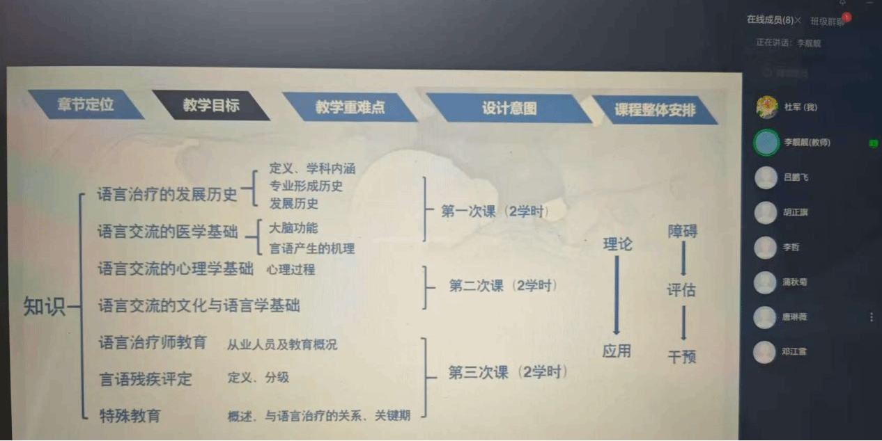 备课团队明确,语言病理学是语言学、医学、心理学、教育学的交叉学科。为明晰学科基础,团队将第一章节拆分为3次课程(共6学时):首次课讲解学科定义、发展脉络及语言交流医学基础,筑牢医学根基;第二次课剖析心理学、文化与语言学支撑,构建多维理论框架;第三次课介绍语言治疗师教育、言语残疾评定及特殊教育,形成“理论-应用”闭环知识体系。