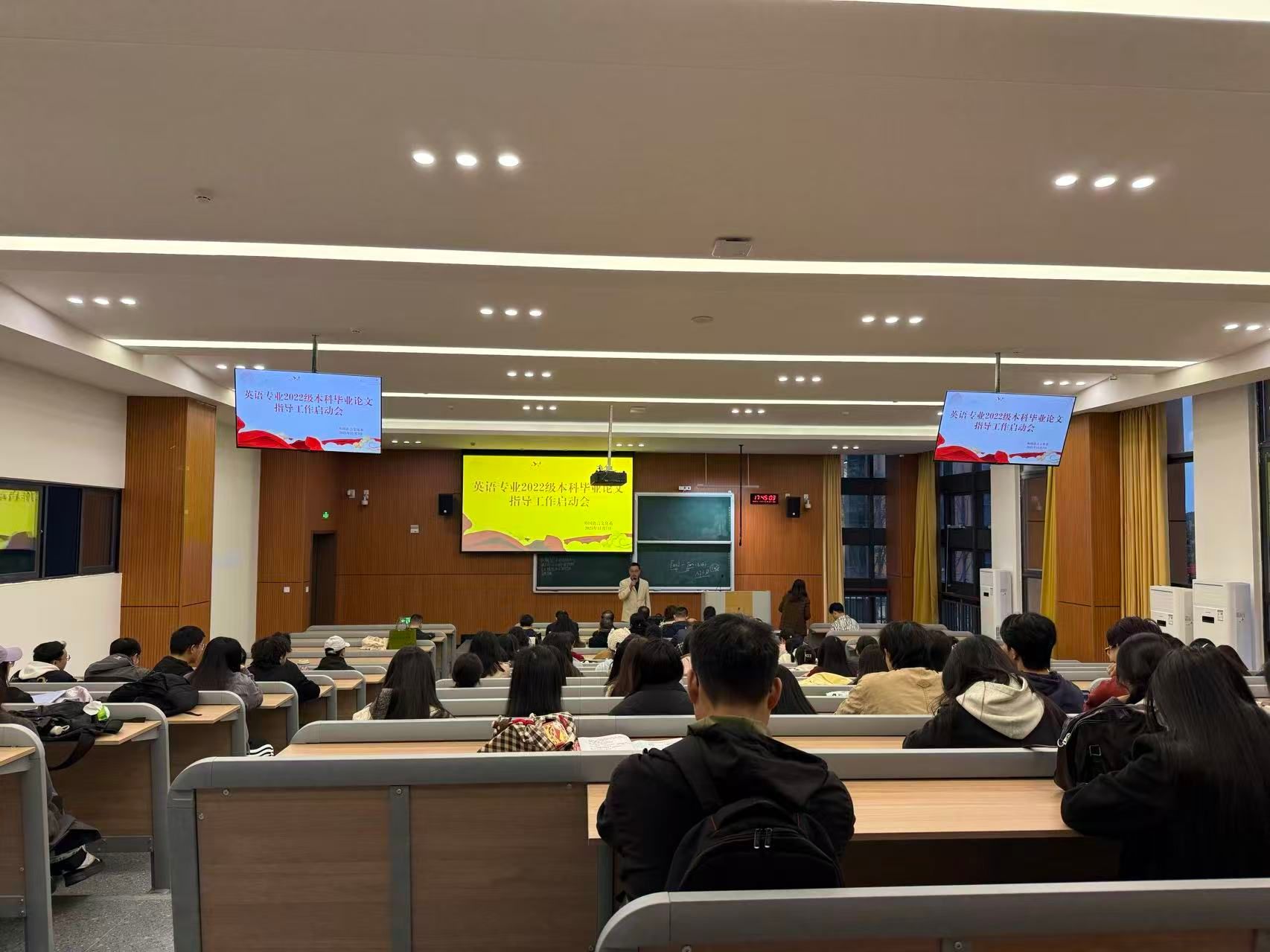 2025年11月7日下午,外国语言文化系在川北医学院临江校区甘露书院南209教室为2022级英语专业全体本科生举行了毕业论文指导工作启动会,标志着本年度毕业论文工作正式拉开帷幕。外语系党总支书记、系主任张思国、党总支副书记李卫星、论文指导老师40人及学生80人共同参会。