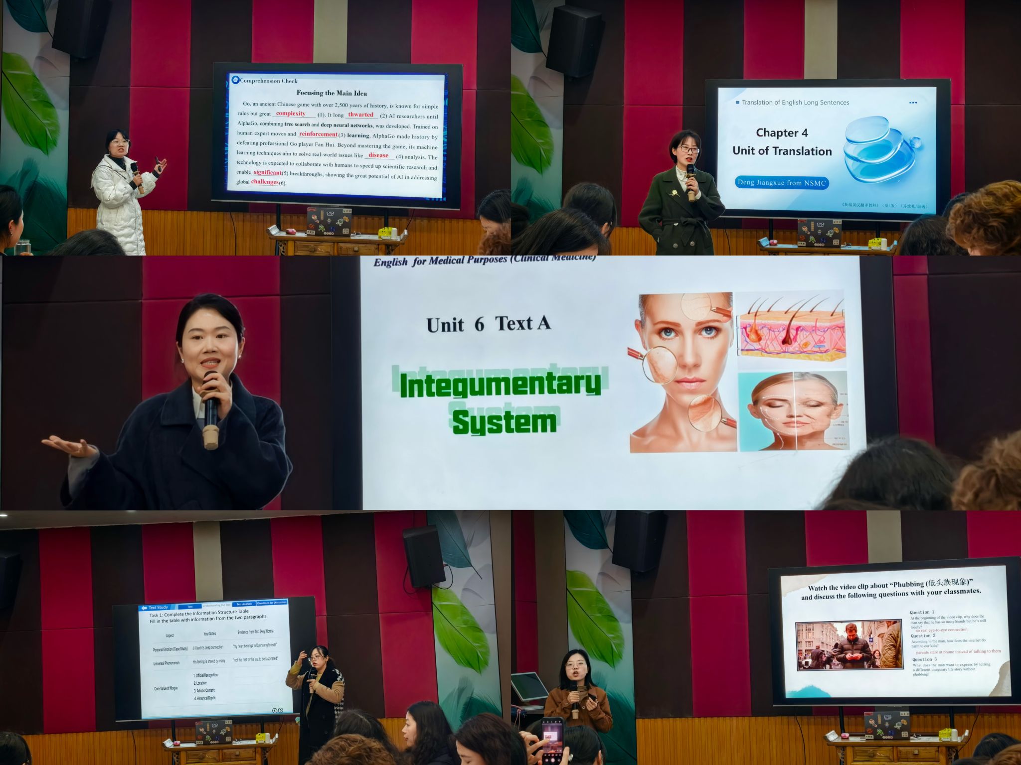 五位参赛教师凭借扎实的专业积淀与精心的教学设计,逐一登台展现教学风采,各有亮点、各具特色。任雪娇老师以“大学英语:Digital Age”为题,结合学生熟悉的生活案例设计互动环节,引导学生深度思考数字时代的机遇与挑战,课堂氛围生动鲜活,充分体现了“以学生为中心”的教学理念;弋倩老师讲授的“医学英语:皮肤结构与功能”,将抽象专业术语与直观图示有机融合,讲解逻辑清晰、重点突出,尽显跨学科教学的严谨性与实用价值;李靓靓老师在“A Break from Screens”课程中,以亲和自然的教态与富有感染力的语言,将人文关怀融入教学设计,传递健康生活理念;邓江雪老师围绕“Unit of Translation”展开教学,从理论阐释到案例实操层层深入,清晰展现了翻译教学的逻辑性与实践性;李哲老师则以“Guardians of Dunhuang”为主题,借助丰富的多媒体资源与生动的文化叙事,让敦煌守护精神具象化,使课堂兼具知识性、思想性与情感温度,引发在场师生强烈共鸣。