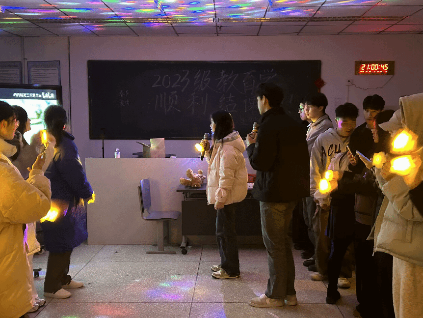随着晚会氛围的升温,令人期待的表演环节悄然降临,此环节以全体同学合唱歌曲《江南》开场。SUMMER老师和王杰同学合作歌曲《有点甜》,让现场充满了温馨的氛围。此外,贾庆苑和潘虹伶两位同学对唱的《素颜》也赢得了大家的一致好评。丰富的节目既展现了教育学方向同学们的多才多艺,也传递了教育的温暖与力量,为每一位参与者留下了深刻的印象。晚会在为同学庆祝生日的温馨祝福中落下帷幕。