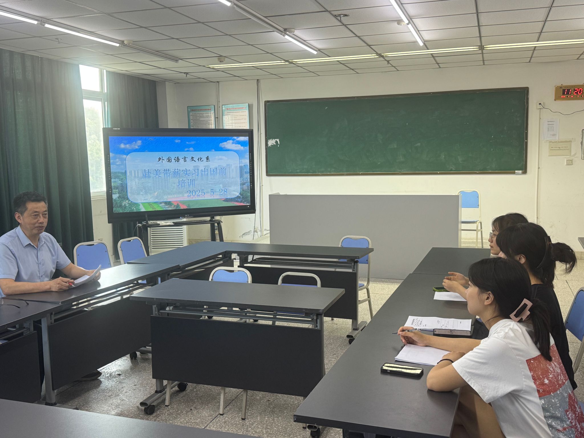 5月28日,外国语言文化系为即将启程的4名赴美带薪实习生举办行前培训。本次培训由外语系党总支书记、系主任张思国主讲,旨在为学生提供全面的国际职场适应指导。