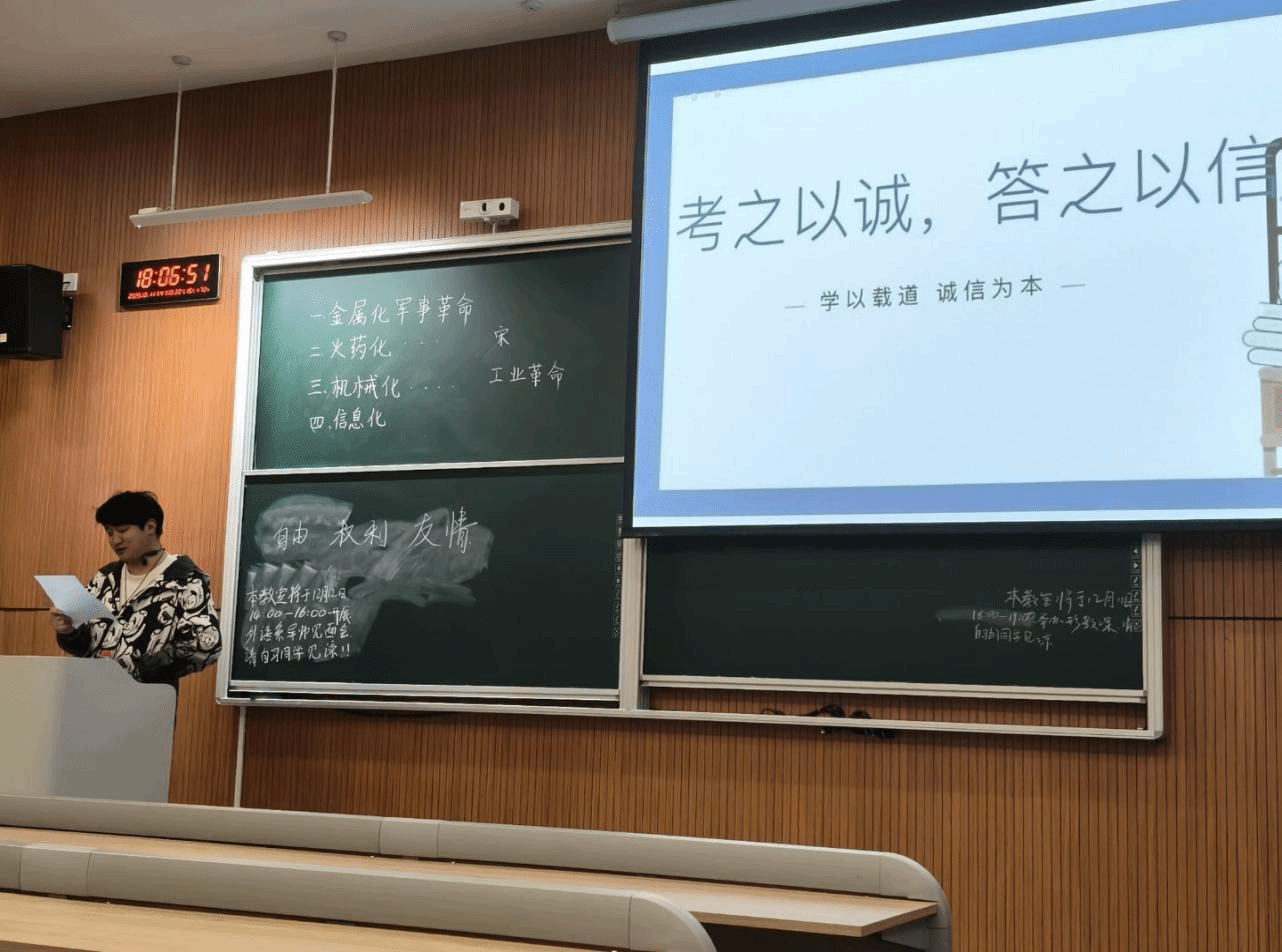 为严肃考风考纪、树立诚信应考意识,营造公平公正的考试环境,12月11日,外国语言文化系在甘露书院南201开展诚信考试教育形教课,推动诚信教育融入学业管理全过程,引导学生自觉践行诚信原则。