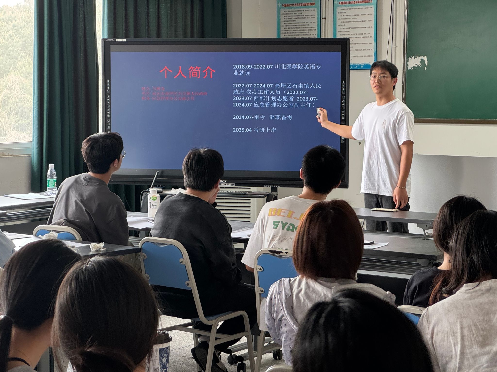 在政策解读环节,马树奇系统梳理了西部计划、"三支一扶"等基层项目的招募流程、待遇保障及发展通道。他结合自身考研经历,重点解析了服务期满后在考研加分、定向招录等方面的优惠政策。针对外语专业特点,马树奇还列举了优秀校友通过基层项目的职业发展案例。这些鲜活的"外语+基层"成长案例,让同学们看到了专业能力在基层的转化路径和发展空间。