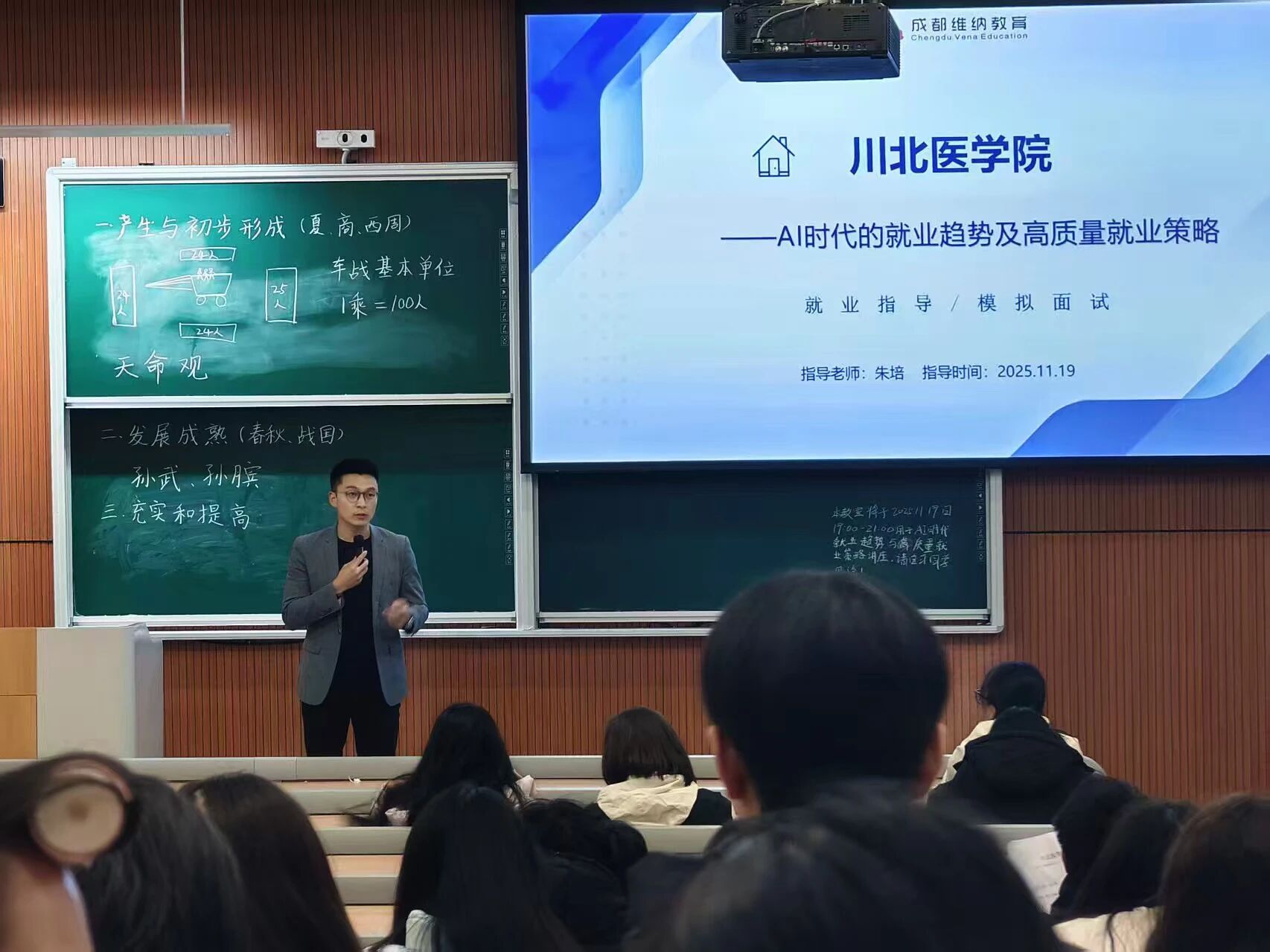 为帮助英语专业学生明确职业发展方向、提升就业竞争力,2025年11月19日,川北医学院外国语言文化系特邀维纳教育朱培老师开展就业指导专题讲座。讲座由辅导员廖文豪主持,面向大一、大二学生系统讲解英语专业的多元发展可能与求职实战技巧。