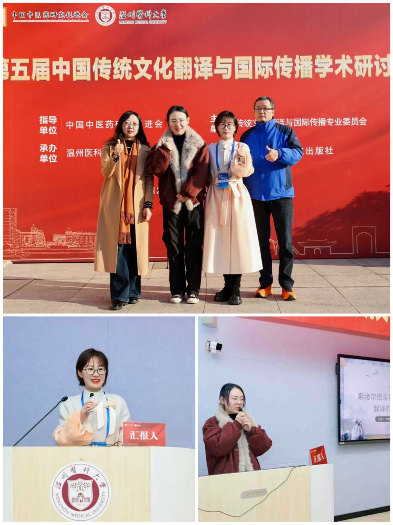 我校外国语言文化系师生代表一行四人受邀参会。外语系MTI教育中心主任邓江雪老师、翻译硕士研究生刘芳吟同学在大会期间作专题发言。其中,邓江雪老师的发言围绕“人工智能辅助下的中医翻译实践及课程优化”展开深度研讨,在向与会专家系统汇报我校外语系翻译教学改革成果的基础上,结合智能技术发展趋势与中医翻译教学痛点,创新性提出技术驱动下中医翻译教学与实践的融合新路径,并针对现有中医翻译课程体系的优化与完善提供了兼具针对性与可操作性的建议,既展现了我系在“外语+中医药”翻译教学领域的探索成效,也为相关领域教学改革与实践创新提供了重要借鉴。刘芳吟同学则巧妙运用索绪尔语言意义理论,以中医经典《景岳全书》中“气血津液”核心理论为研究载体,开展跨学科的语言学深度解析,为中医典籍翻译研究开辟了跨学科视角,充分彰显了我系研究生扎实的学术功底、严谨的科研思维与突出的创新能力,获得与会专家评委的高度认可与一致好评。