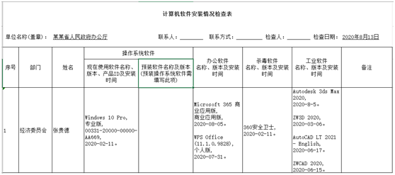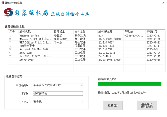 在正版软件检查工具工作页面,先填写单位名称、部门和姓名,再点击【检查】按钮,在软件信息采集进度条中会显示采集进度,检查完成后会提示“数据采集完成!” ,并提示信息采集时间。同时,在计算机检查结果栏目中显示本计算机安装的操作系统、办公软件及杀毒软件的软件名称、软件版本、安装时间等信息。