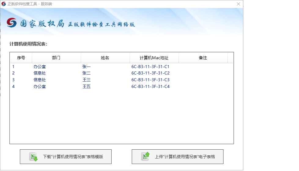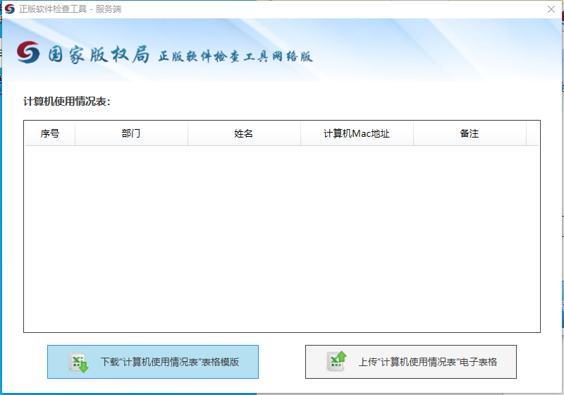 (1) 系统管理人员运行“正版软件检查工具网络版服务端”,点击“上传计算机使用情况表”按钮,弹出计算机使用情况表维护界面。