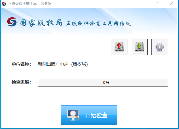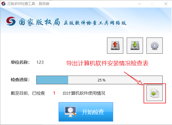 (1) 检查组工作人员运行“正版软件检查工具网络版服务端”,点击“开始检查”按钮,检查进度条中将定时更新检查进度。注意,检查当天单位员工应尽量保证个人办公使用的计算机开机且正版软件检查工具网络版客户端处于运行状态,以免漏查。